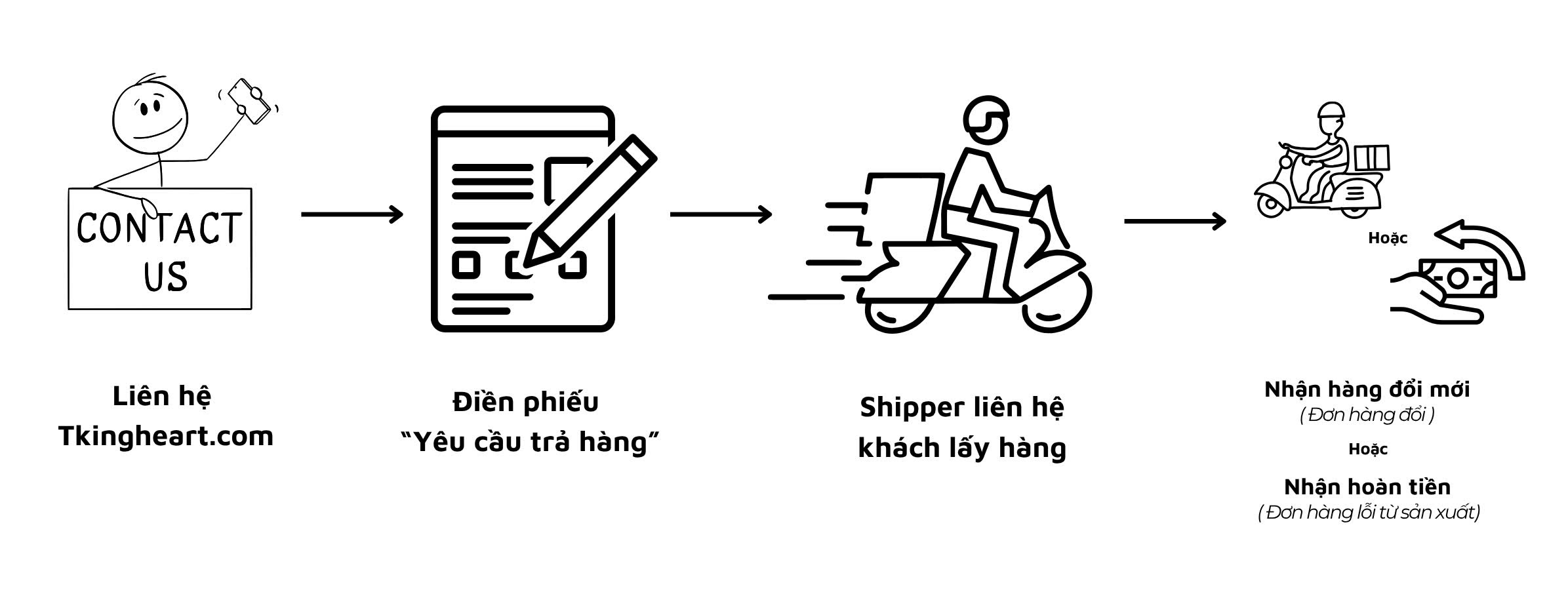 Bước 4 : Sau khi đơn hàng được hoàn về thành công , shipper sẽ liên hệ quý khách nhận đơn hàng mới / hoàn tiền đối với đơn hàng lỗi từ phía sản xuất.